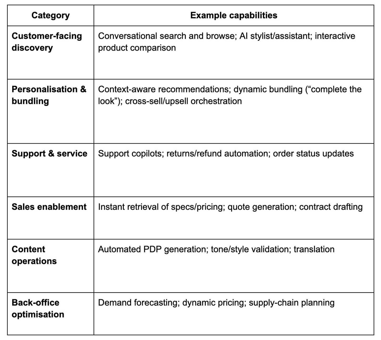 Agentic commerce spans both customer‑facing and internal capabilities. The following map categorises common use cases: