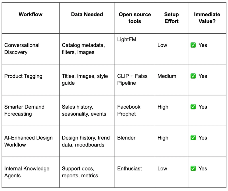 Below is a quick-start matrix designed for fashion teams. It highlights what each use case needs, what tools can accelerate experimentation, and whether it’s worth testing immediately.