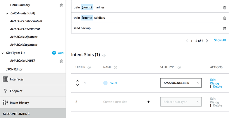 Also, in the "Intent Slots" section, make sure to add a slot called "count" and mark it as AMAZON.NUMBER. This will instruct Alexa to look for numbers in this slot and parse them as integers before passing to our backend.