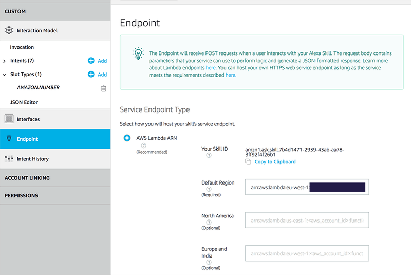 Once that's configured, we'll need to provide function ARN as an endpoint in Alexa Skills Kit.