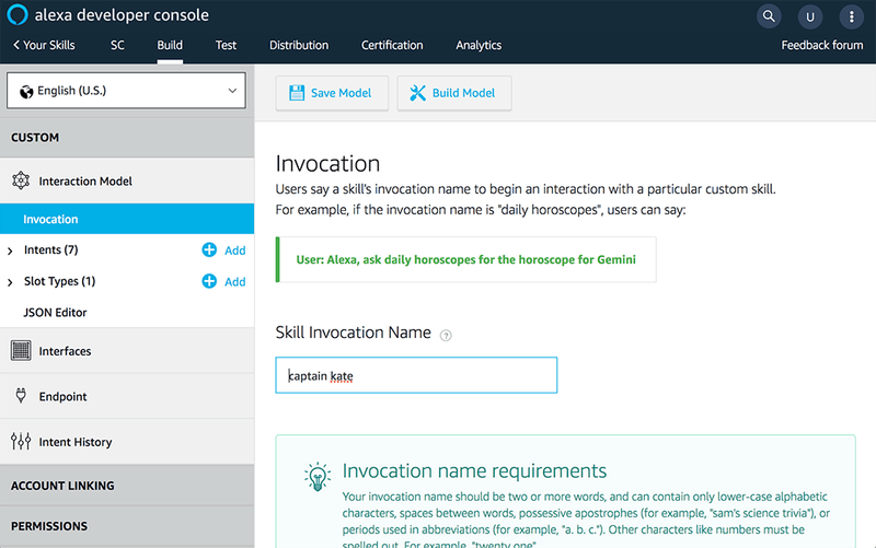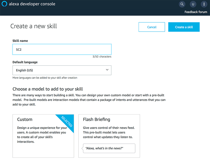 The initial config is pretty straightforward - all you have to do is to enter a name and confirm creating a new skill (make sure to keep the model set to "Custom Skill").