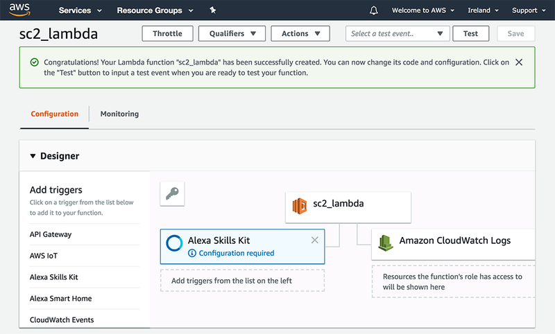 You can now save the function and go into Amazon Developer console to give your skill a try. If you have an Alexa-enabled device connected to the same Amazon account you're using for development, you can use it for testing.