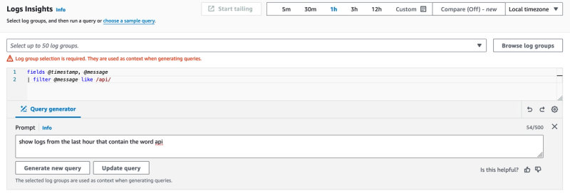 This feature is useful when a user needs to query a tool with its own specific query language or with a structure that the user doesn’t know. AWS seems to be running an A/B test of a feature where you can generate a CloudWatch search query based on a natural language input.