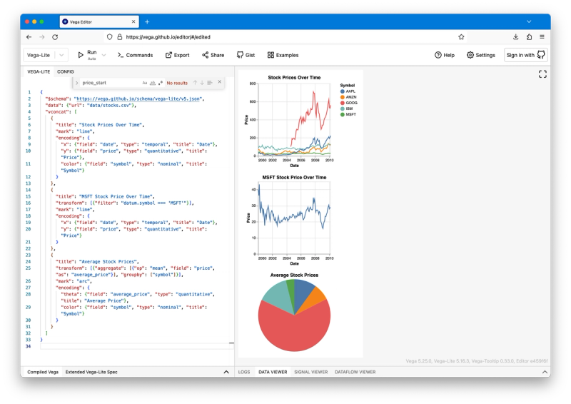 Fortunately, there’s a tool called Vega which is a visualization grammar that allows you to define graphs using a JSON schema. It also comes with Vega-Lite, which allows us to easily render these charts using JavaScript. There’s also an interactive playground that we can use for testing our diagrams.
