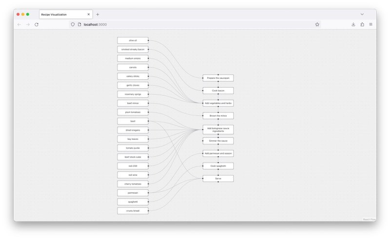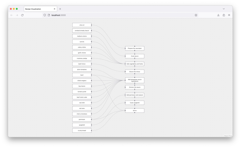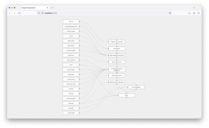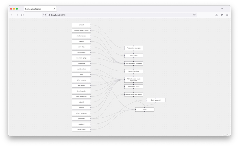 We can use GPT to transform a recipe into a graph, defined by a JSON structure. It can then be used to, for example, present step-by-step instructions or visualizing dependencies between them.