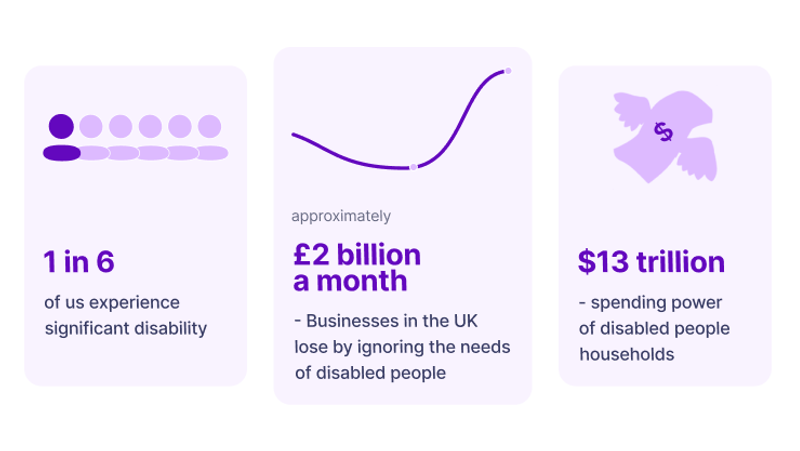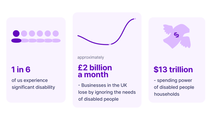 The Purple Pound report reveals even more eye-opening statistics from the UK market, highlighting what e-commerce is missing due to inaccessible solutions. In the UK alone, 4 million people abandoned retail websites due to accessibility barriers, costing businesses £17.1 billion in 2019. In 2023, the global spending power of disabled households was estimated at ﹩13 trillion, growing by 14% annually, yet only 10% of businesses have a targeted strategy for this market. Additionally, accessibility helps create a positive brand image and enhances SEO results.